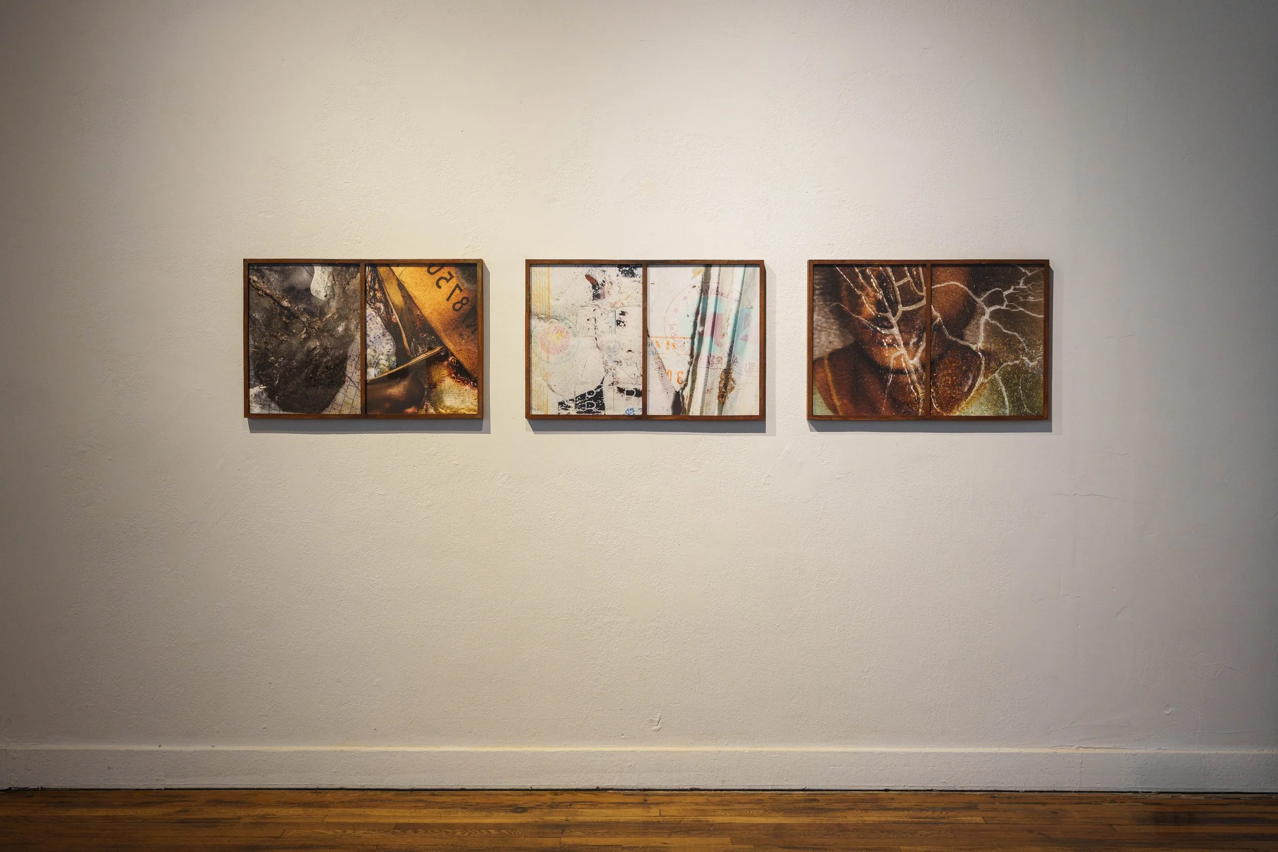 Installation view at Pidgin Palace, three 20x30” diptychs, Corten steel frames, Tucson, AZ, 2025